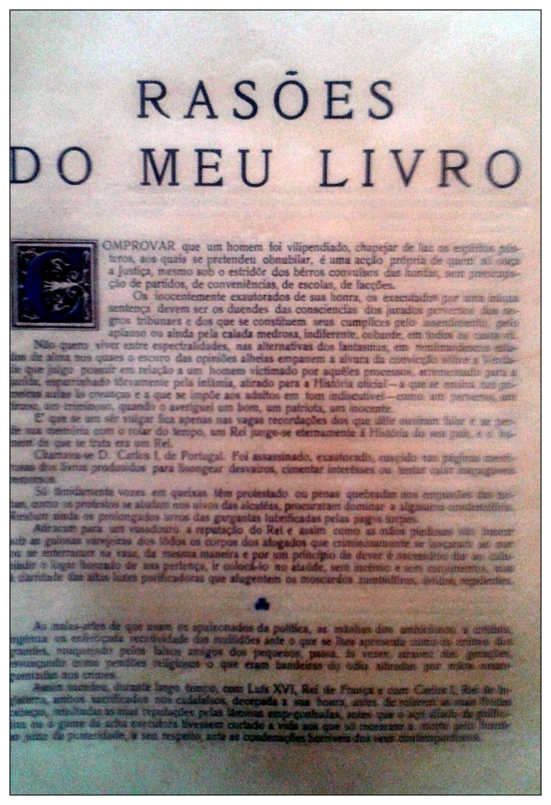 Comecei a passar as folhas (não a folhear o livro porque aquilo não está encadernado, são folhas soltas como se fossem a composição de um documento para ser impresso e se transformar num livro ) e naturalmente não percebi nada. Sabia apenas que era a história do reinado do Rei D. Carlos, porque é o que diz o título.